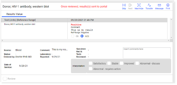 For example, in the Unified Sign Queue, lab results requiring physician review before release will be indicated with the following statement at the top of the results: Once reviewed, result(s) sent to portal (see image below).