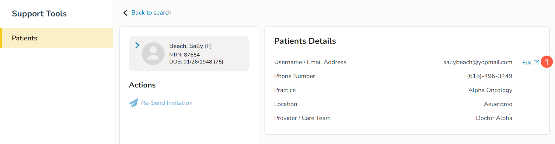 - In the Patient Details section, click the new Edit icon next to the Username / Email Address field (callout 1).