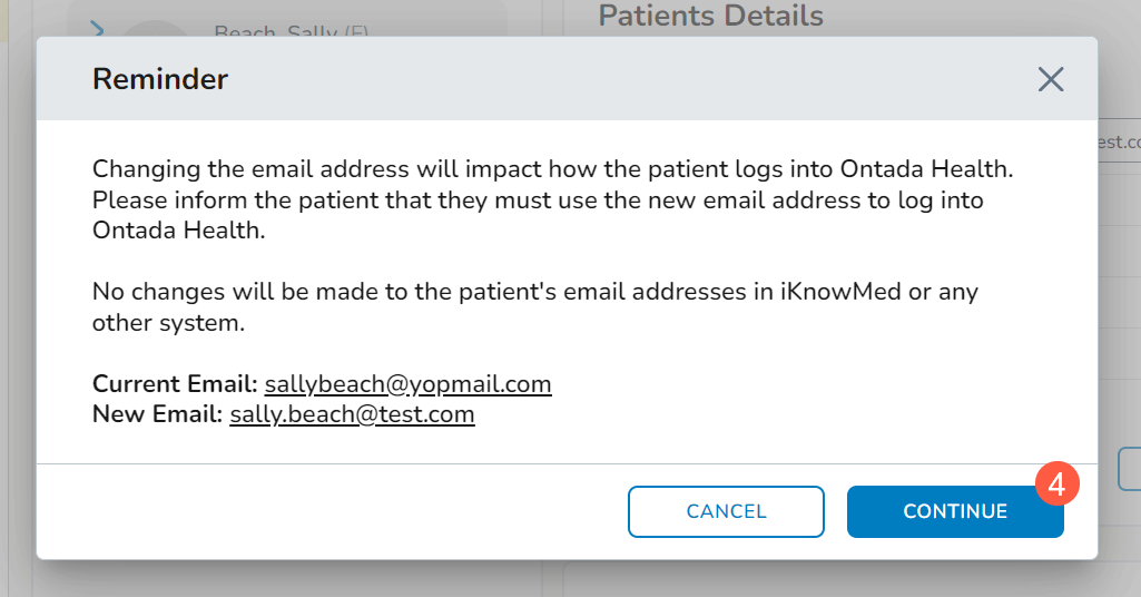 - If the patient has already created an Ontada Health account, they must log in using the newly selected email address going forward.