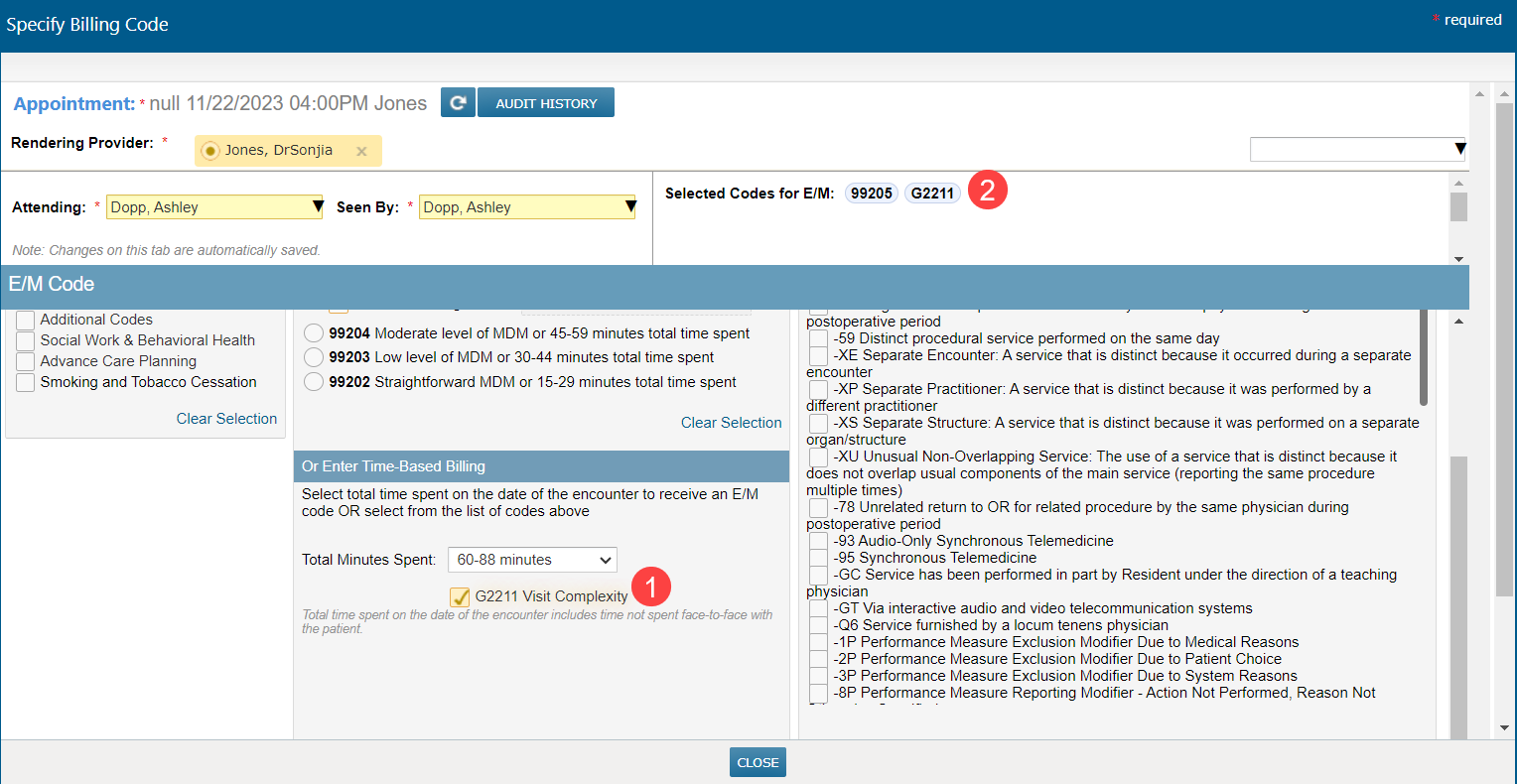 - A checkbox to add G2211 will become visible after you have selected it from the drop-down. Check the box to add G2211 to your visit (callout 1).