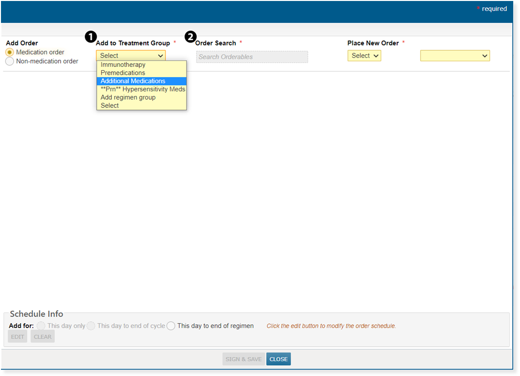 To streamline this process, the Additional Medications treatment group will always be an option, without searching, when adding the order. Users can also still search for and select a different treatment group if desired.