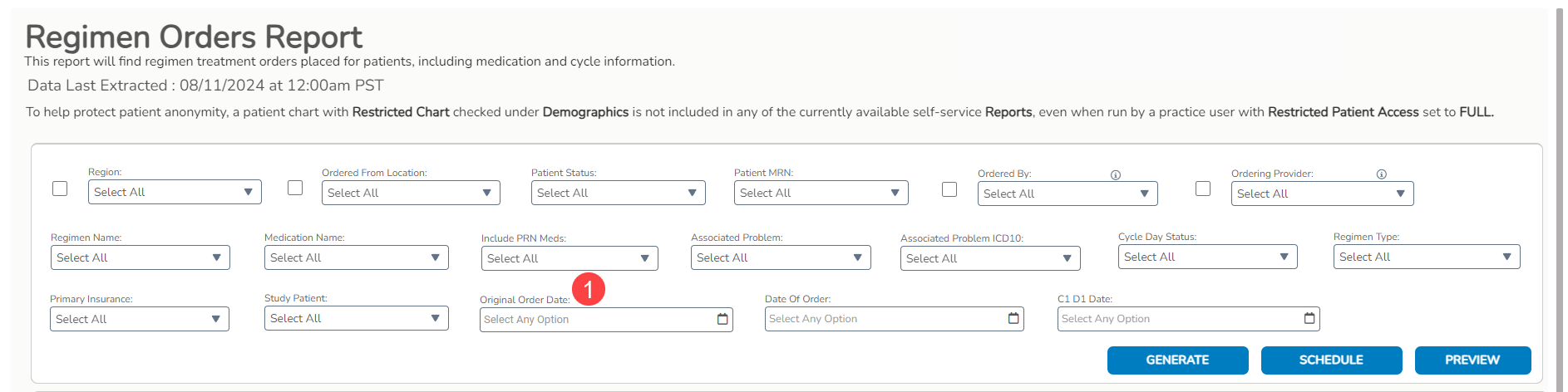 The Regimen Orders Report has been enhanced with a new Original Order Date filter (callout 1). This allows pharmacy teams to refine their searches beyond C1D1 or actual order dates, aiding in the evaluation of treatment plans.