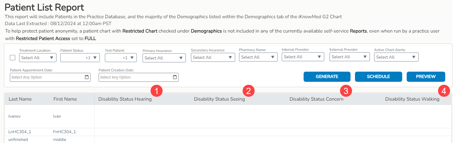 The Patient List Report now includes additional columns capturing results from the Disability Status section found in the Demographics tab of the patient’s chart (see callouts 1-4 for examples).