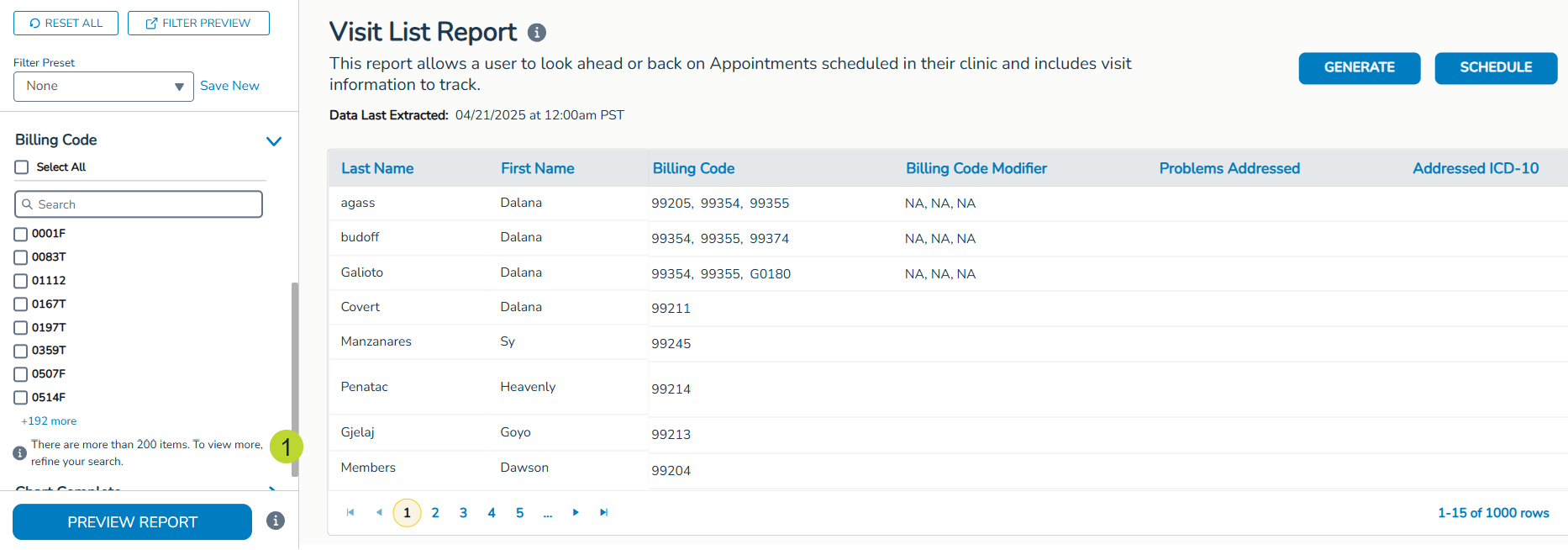 To ensure you’re aware of all available filtering options, we’ve added informational text at the bottom of filter drop-downs. If a filter contains more than 200 items (e.g., billing codes), you’ll see a message indicating that there may be additional items beyond the initial display (callout 1). This will help you understand the potential scope of your filtering options.