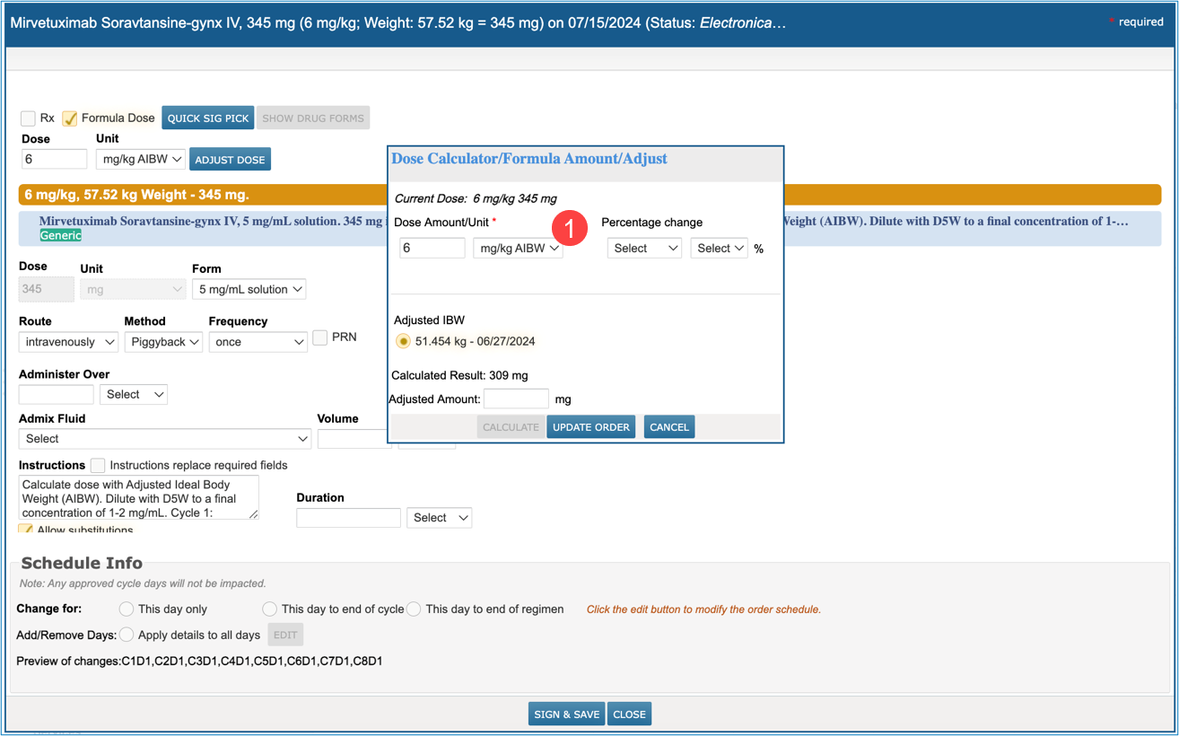 We are updating Mirvetuximab dosing to enhance patient safety and compliance. New orders will now calculate dosing based on Adjusted Ideal Body Weight (AIBW) with the Devine formula for the Ideal Body Weight. Users will no longer have the option to calculate dosing based on the patient’s actual body weight.