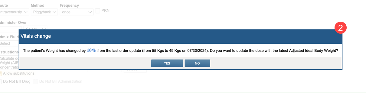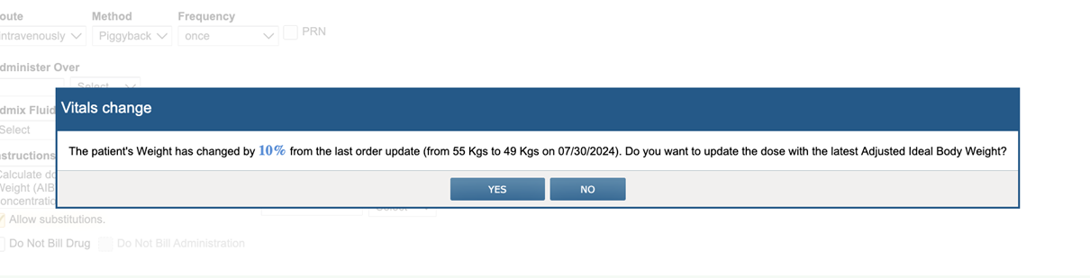 - Clicking No will open the order editor without applying the AIBW calculated per the patient’s latest recorded weight. Continue the ordering process as usual using the patient’s actual weight for calculation.
