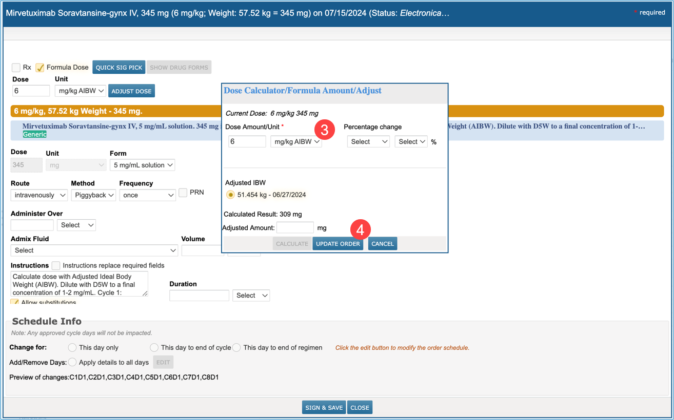 - Click Update Order to apply the AIBW weight to the formula dose order (callout 4).