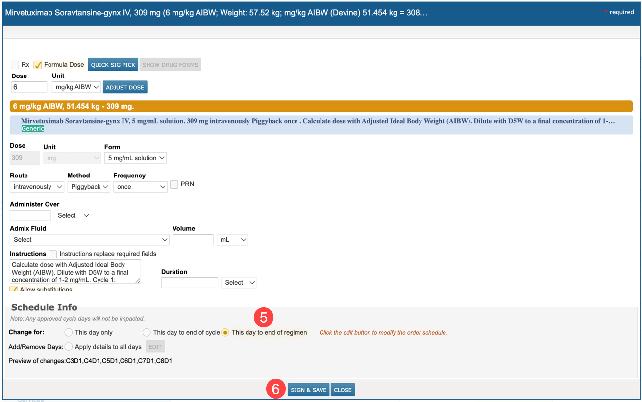 - Choose the This day to end of regimen option to apply changes to all regimen cycle days (callout 5).