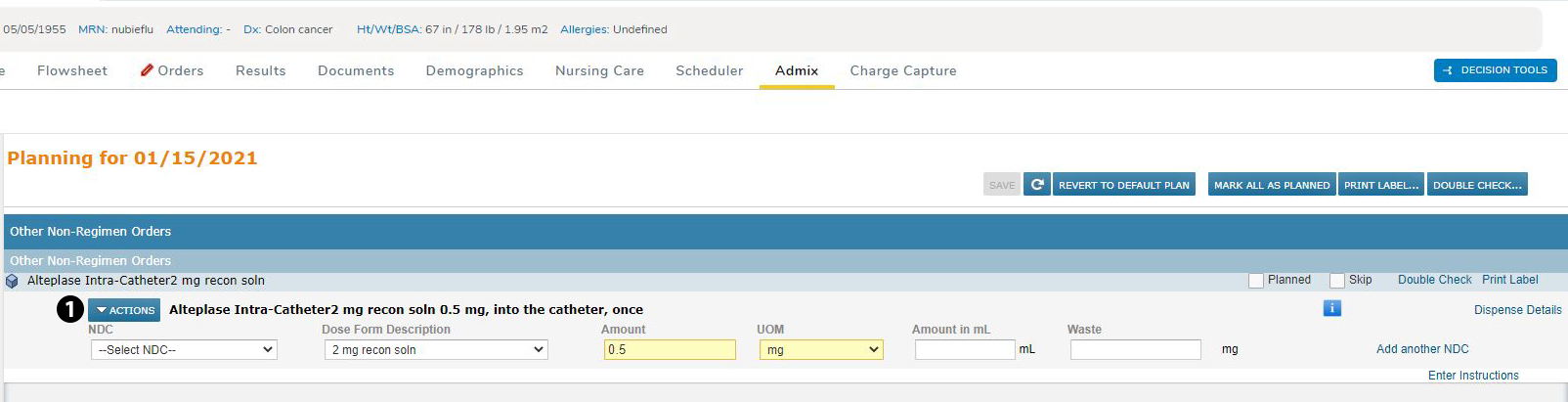 The Worklist Queues > Admix page will now include orders to be administered by intra-catheter, Inhalation, Topical, Feeding Tube, G-Tube, J-Tube, Rectal, and Intra-pyelocalyceally (see callout 1). This gives pharmacists, technicians, and/or nurses a place to provide instructions on how these treatments will be prepared as well as allow them to generate a label for the drugs.
