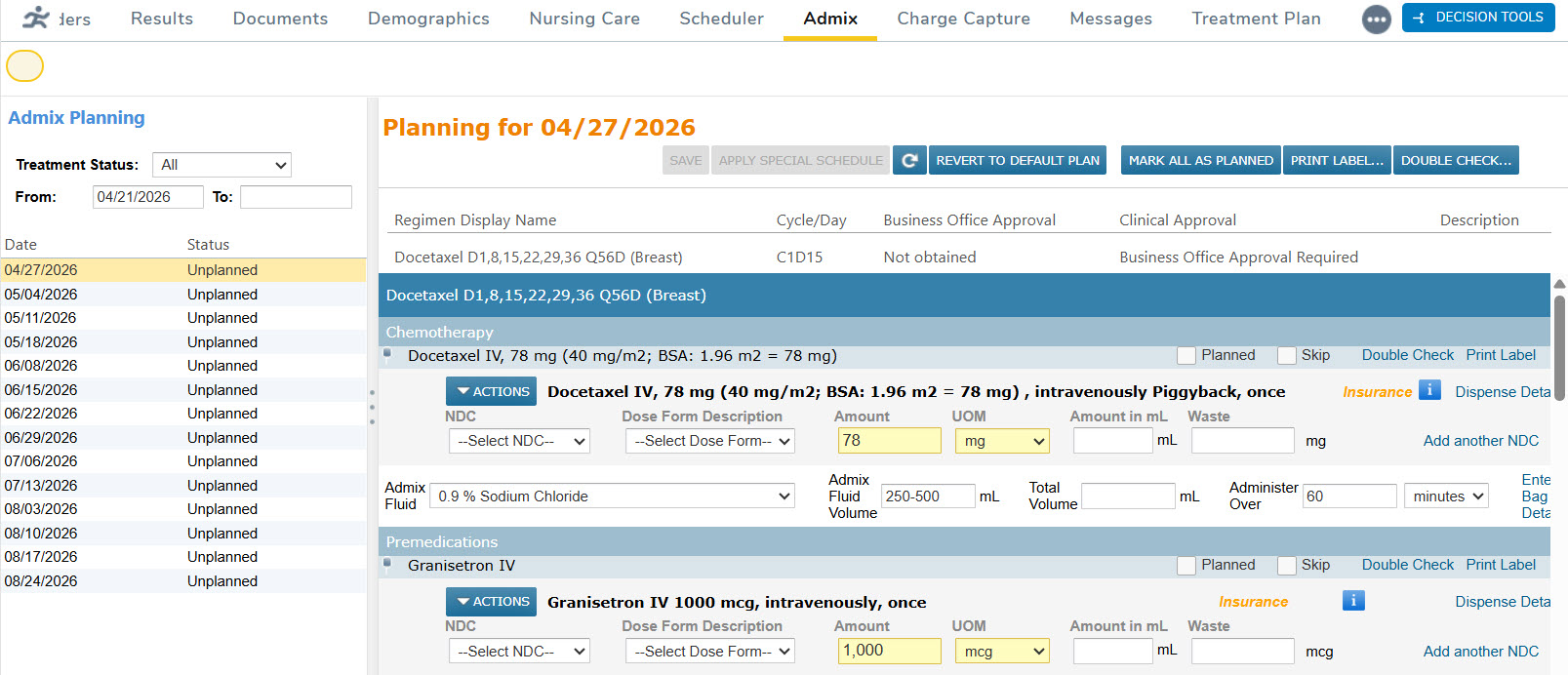 The Apply Special Schedule button in the Admix Planning queue will now be grayed out — just like the Save button — until the required NDC and Waste fields are completed.