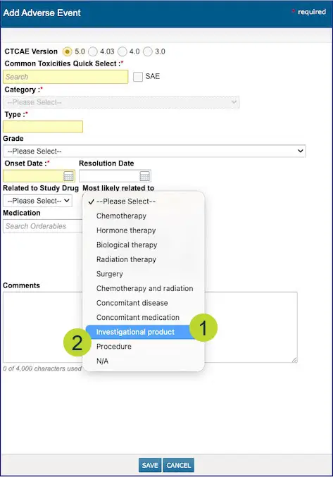 Two new options are available in the “Most Likely Related to” dropdown when documenting Adverse Events (callouts 1 and 2):