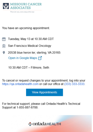 - Enabled by default: Patients will automatically receive appointment reminder emails. If your practice prefers not to send reminders, please contact your Ontada Health Account Manager to have them disabled.