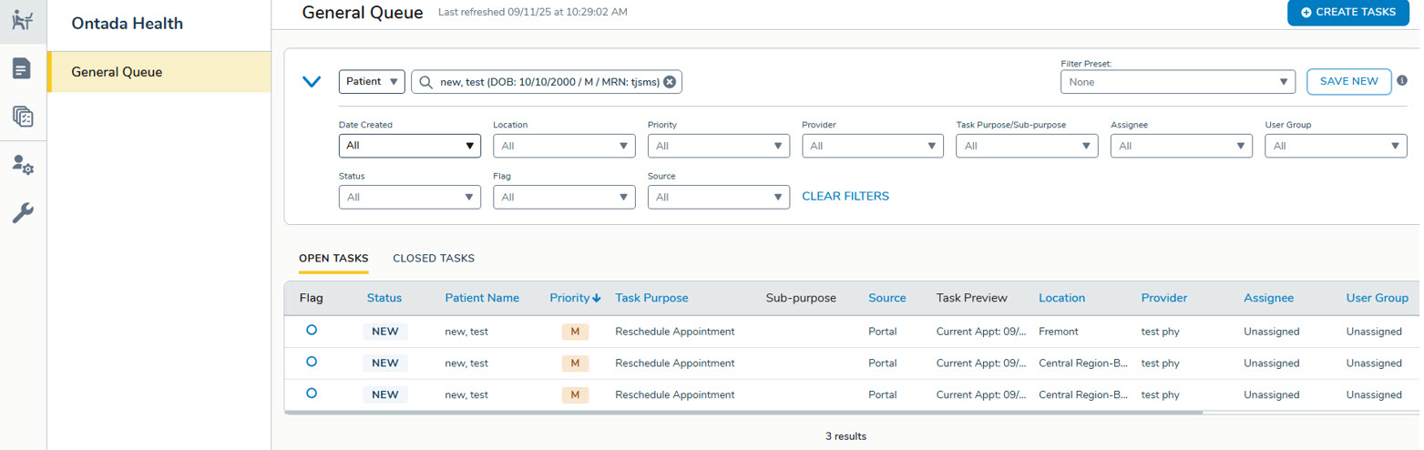 A rescheduling task is created in the General Queue so your staff can be alerted that they must contact the patient to arrange a new appointment.