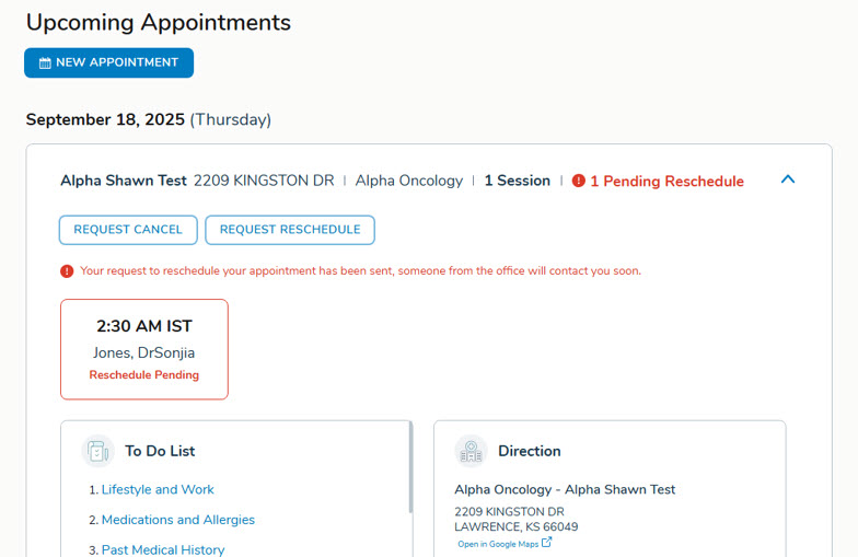 In the patient portal, the affected appointment is highlighted in red and marked as pending with the message: Your request to reschedule your appointment has been sent. Someone from the office will contact you soon. Once the task is completed, the pending status is automatically cleared.