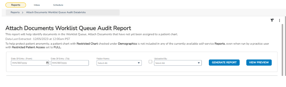 For users with Reports permissions set to Full for Administration or Office Manager, the Attach Documents Worklist Queue Audit Report assists in identifying documents in Worklist Queues > Attach Documents that are yet to be assigned to a patient chart.