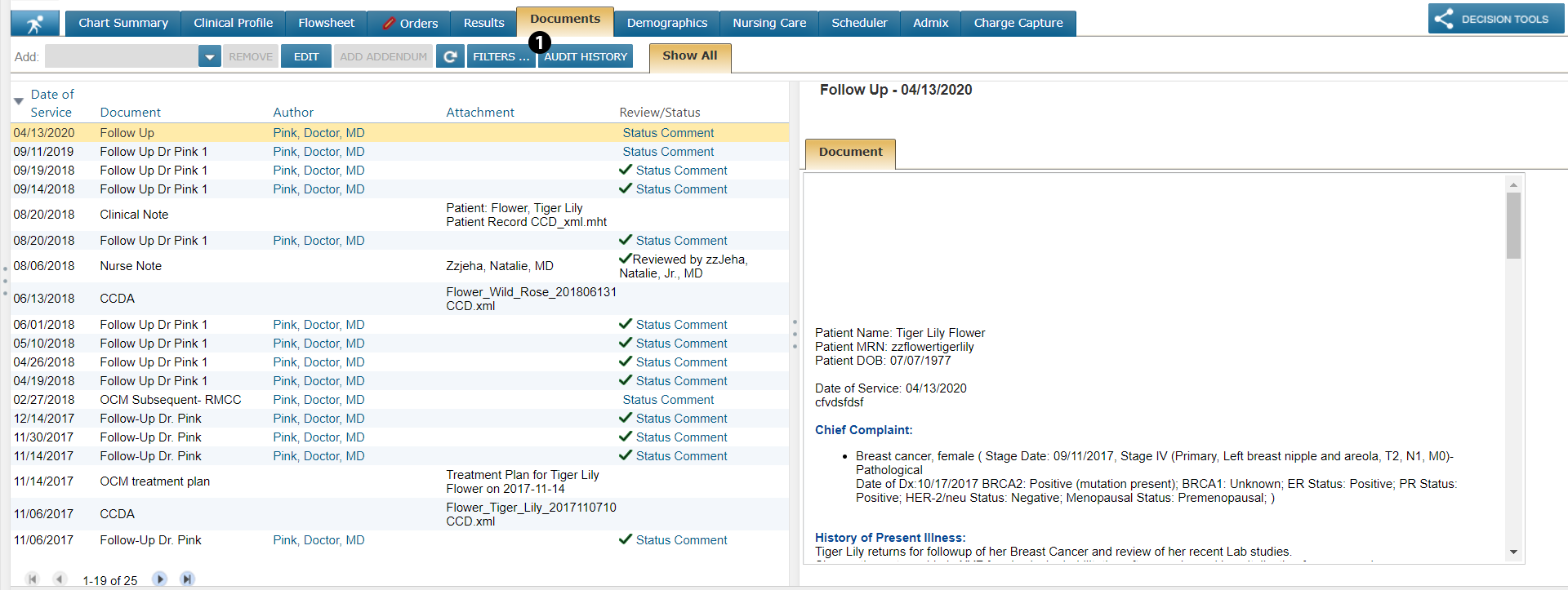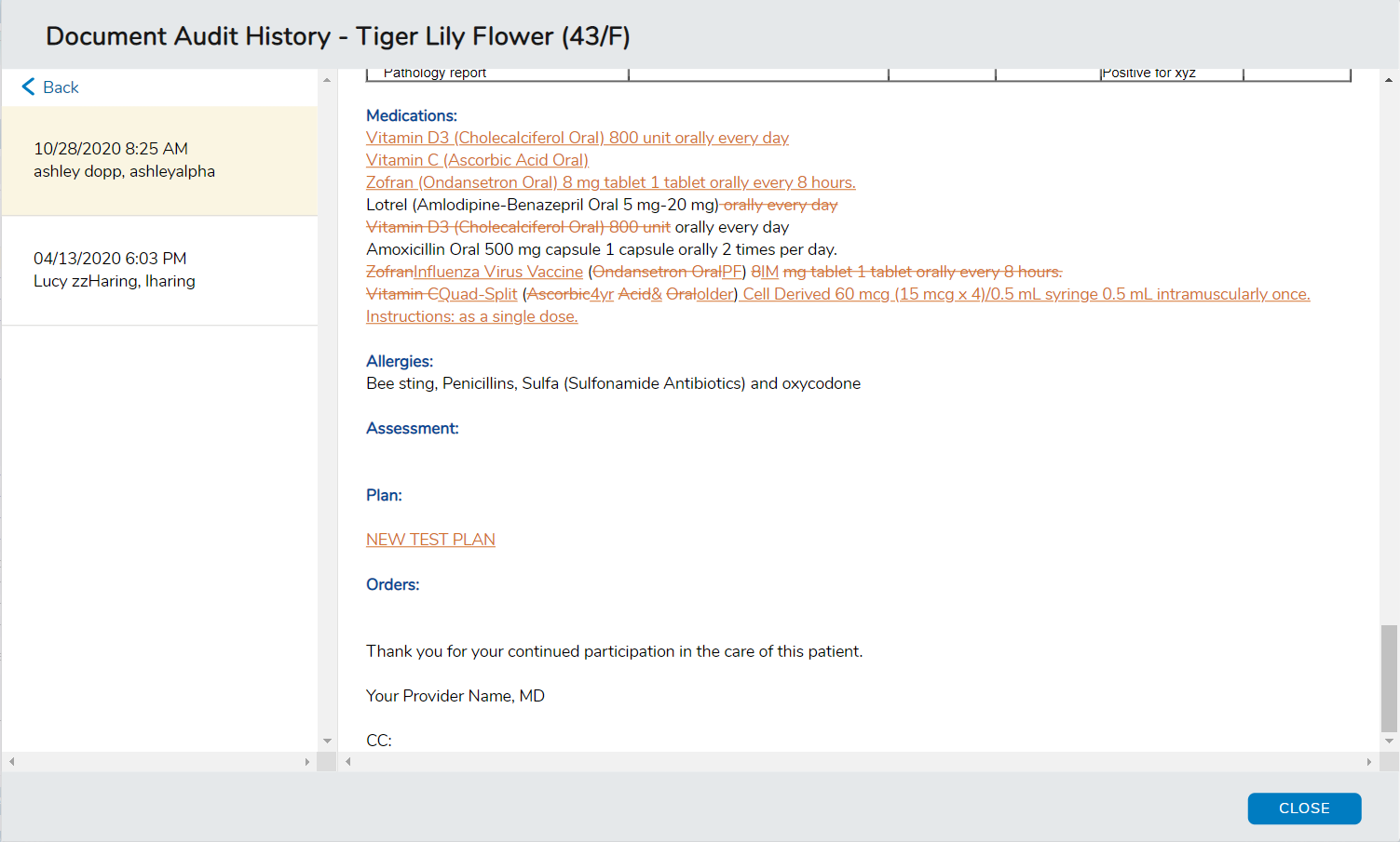 You can now view changes made to a clinical note, such as what text was added and removed, to assist tracking the document through its workflow. The new audit history feature captures the following actions: Added, Edited, Removed, Restored, Amended, Service Date Changed, Signed, Reviewer Added, Faxed, and Messaged.