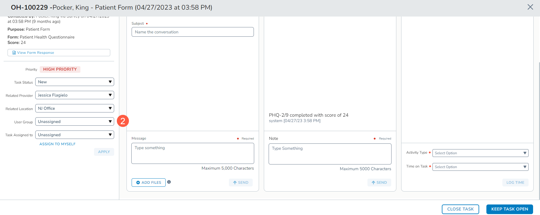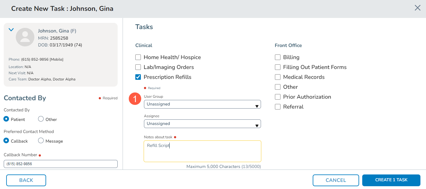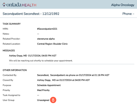 1. Task assignment simplified: When creating and assigning tasks, Ontada Health users can select a User Group as needed (callouts 1 and 2).