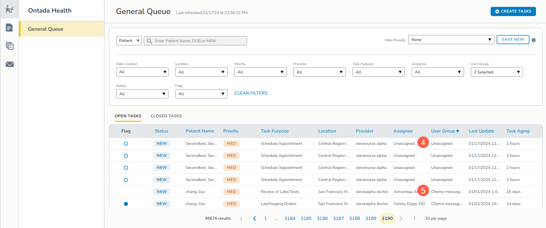 3. User Group responsibility: Similar to individual user assignments, tasks will be marked as Unassigned under the User Group column initially (callout 4). Once a User Group is assigned to a task, the queue will reflect that the User Group is responsible for the task (callout 5). Permissioned users have the flexibility to change an assigned User Group at any time while the task is still open.