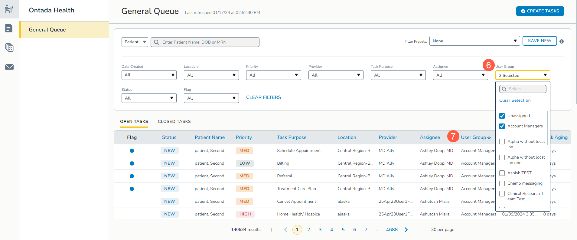 4. User Group filtering and sorting: The User Group field in the filters and column in the table can be filtered and sorted as needed to locate unassigned User Group tasks or tasks assigned to specific User Groups (callouts 6 and 7).