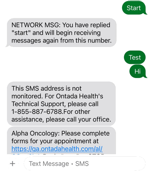 The automatic reply will state: “This SMS address is not monitored. For Ontada Health’s Technical Support, please call 1-855-887-6788. For other assistance, please call your office.”