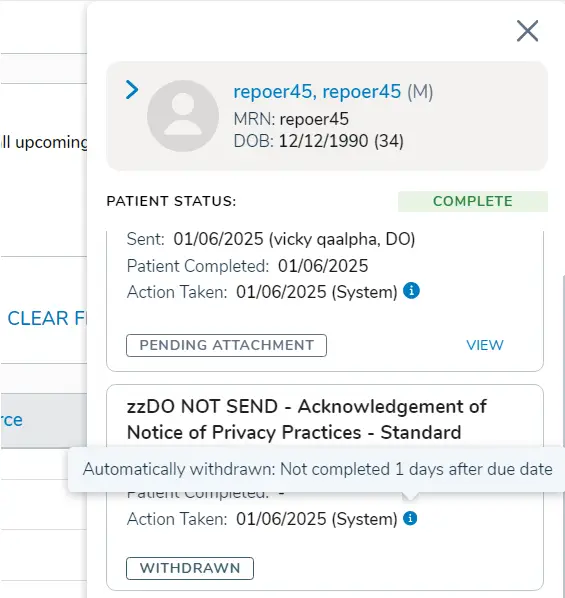 By default, the system will automatically withdraw any incomplete forms 7 days past their due date; however, this time frame can be customized based on your practice’s preferences.