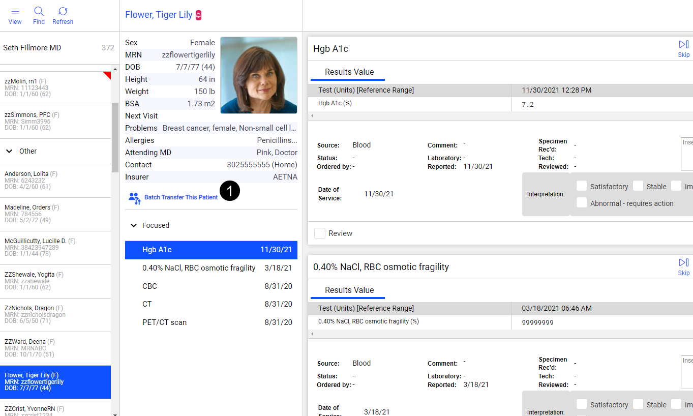 Select a patient in the queue and click Batch Transfer This Patient in the middle panel to initiate the process (see callout 1).