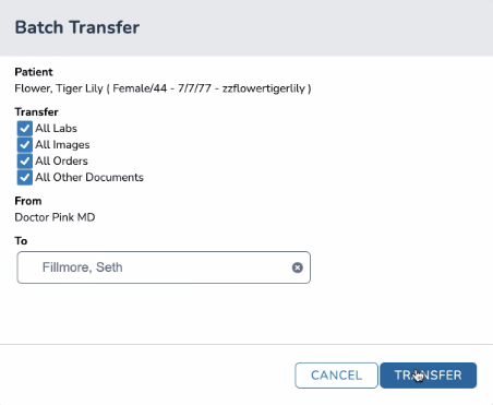 A dialog box will appear, allowing users to select which of the patients’ items to transfer, i.e., all labs, images, orders, or other documents, as well as which provider should receive the transfer (see image below).