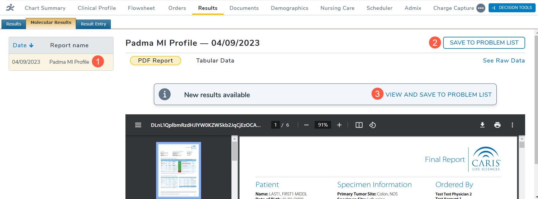 - A red dot will be placed next to the test results not saved to the problem list from Molecular Results.