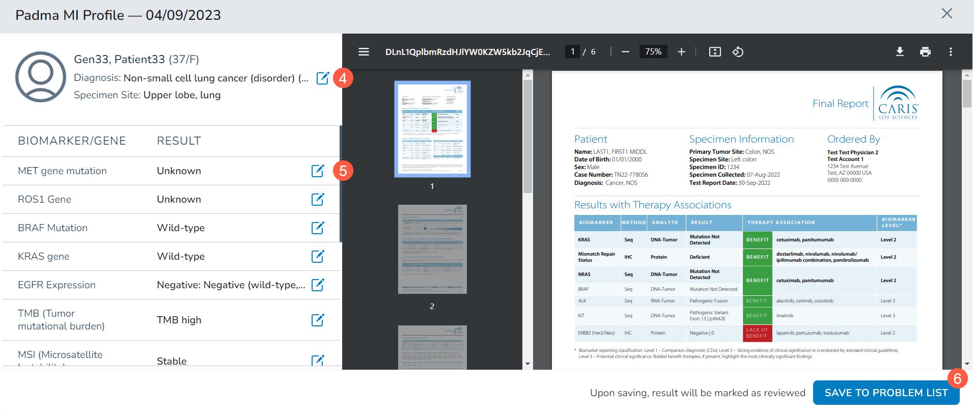 - Choose or modify all results as needed using the edit icon (callout 5). Some biomarker results will be automatically populated and we are working to expand the number of biomarker results that can be auto-populated.