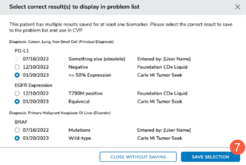 - If there are previously recorded results for a biomarker, the system will prompt you to select which results to save to the Problems tab.