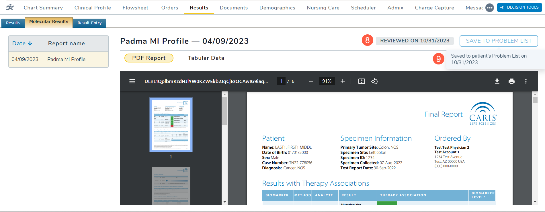 - After saving the results to the Problems tab, a gray badge will appear on the Molecular Results page, indicating when the results were last reviewed (callout 8). Hover over the grayed-out button to see when these results were saved to the Problems tab (callout 9).