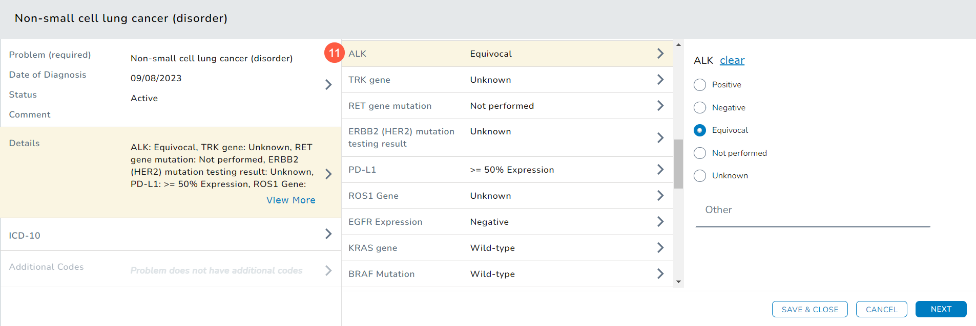 - Below the diagnosis section, certain biomarkers will have results prepopulated in the Result column. For other biomarkers, you must manually select a result.