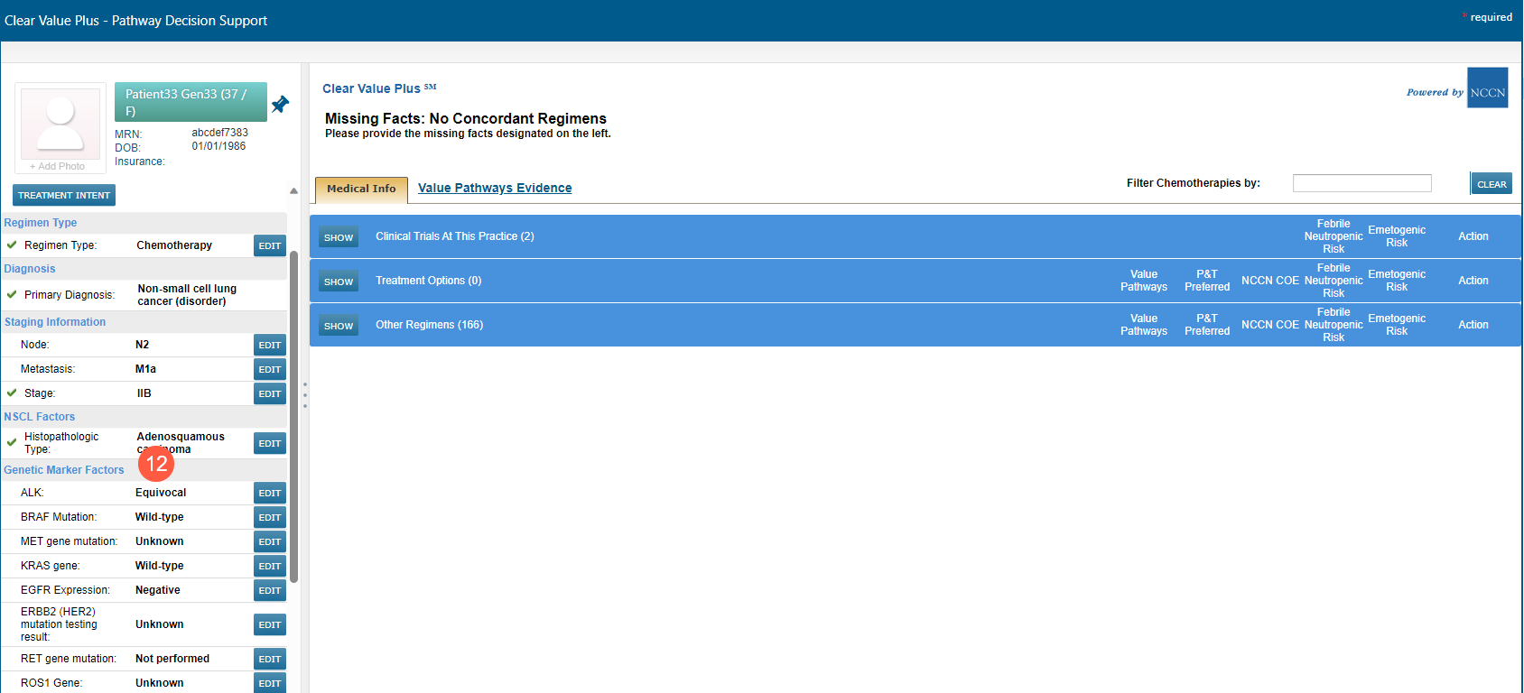 NOTE: Each time results are reviewed, a disclaimer will be displayed at the bottom of the screen to remind users that the information presented is sourced from a third-party vendor and that any auto-populated results are generated based on NCCN guidelines purely for informational purposes.