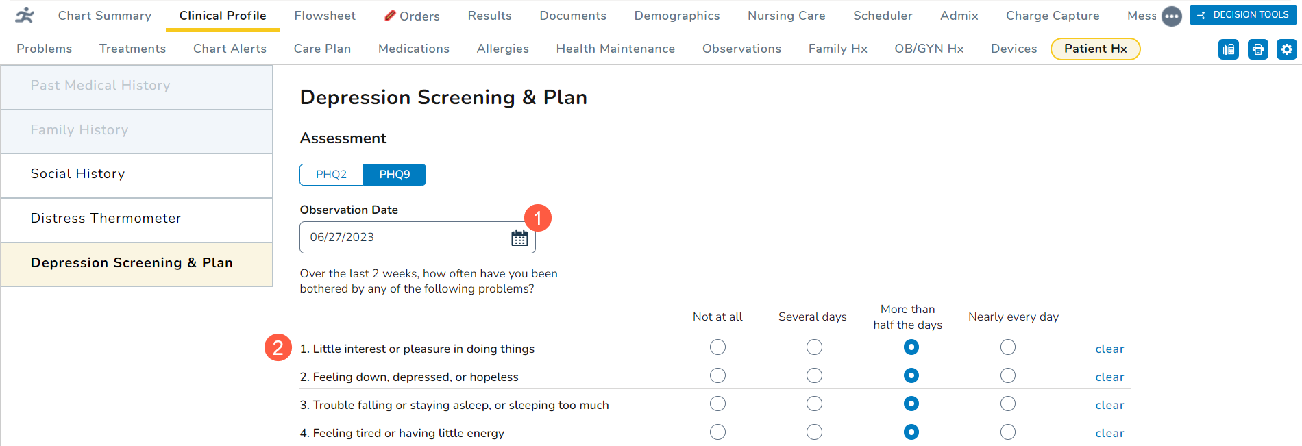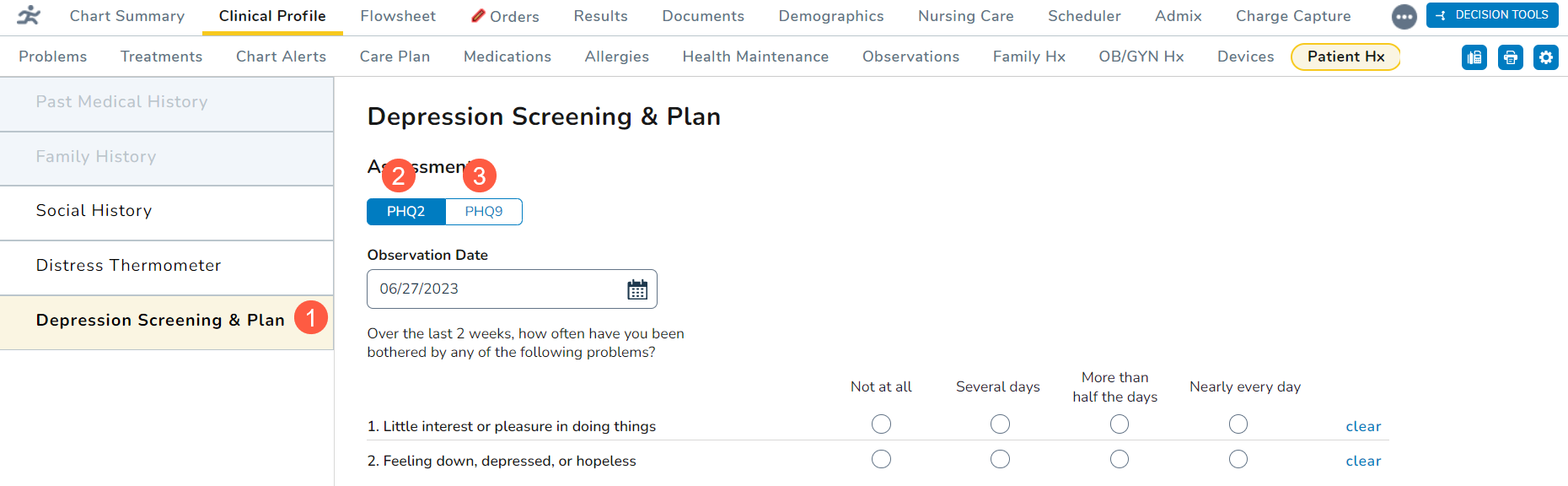 - Click on the new Depression Screening & Plan tab (callout 1).