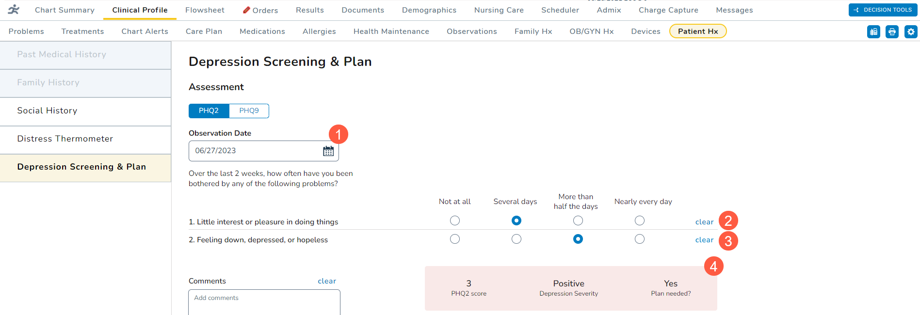 - Choose whether the patient was screened using the PHQ-2 or PHQ-9 questionnaire (callouts 2 and 3).