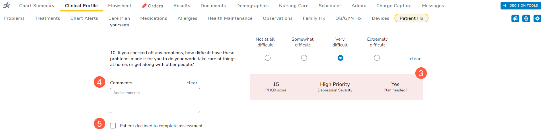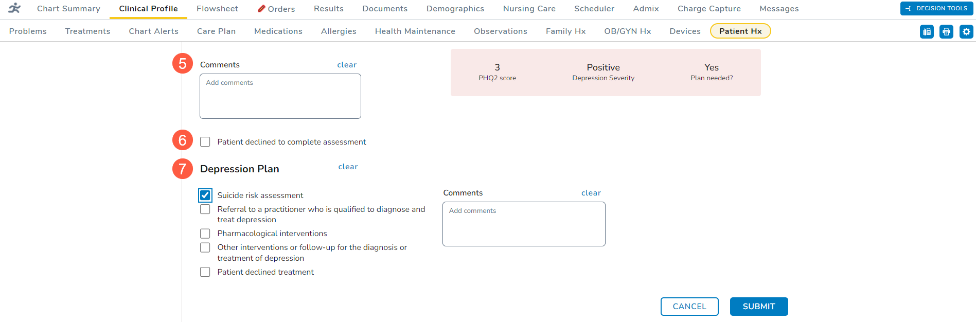 - Use the Depression Plan section (callout 6) to capture the next steps and comments on to move forward with treating the patient, if needed.