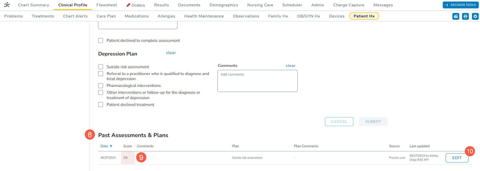 - Use the Depression Plan section (callout 7) to capture the next steps and comments on to move forward with treating the patient, if needed.