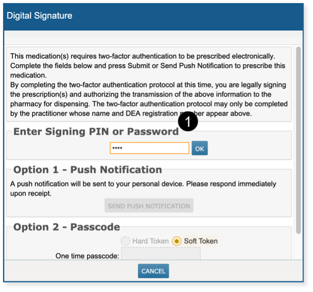 At the time of saving an electronic prescription order for one or more controlled substances, providers will see the Digital Signature pop up and must enter their Signing PIN or Password (see callout 1) followed by the designated second factor – Push Notification or Soft or Hard Token.