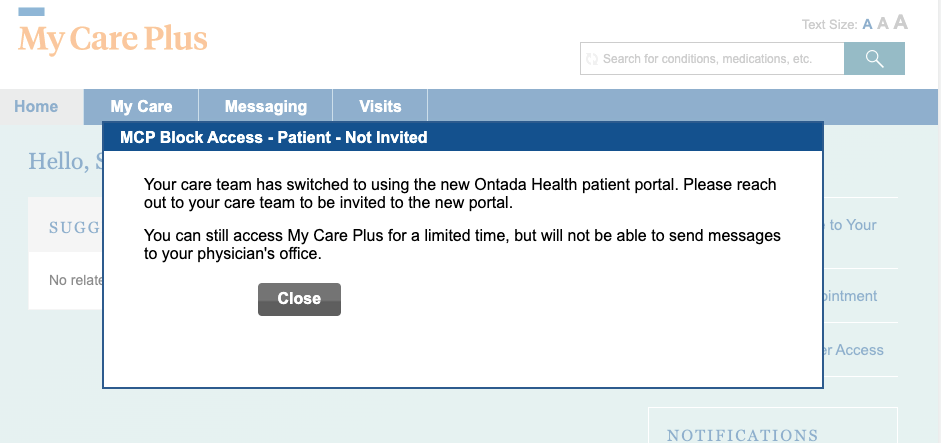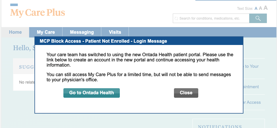 The patient can click Close to continue to My Care Plus or Go to Ontada Health to be presented with the Ontada Health login screen.