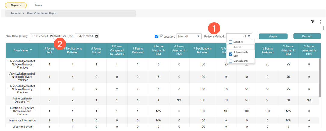 To help practices better understand how many forms are being sent manually vs how many are being sent automatically, we added a new Delivery Method filter to the report (callout 1).