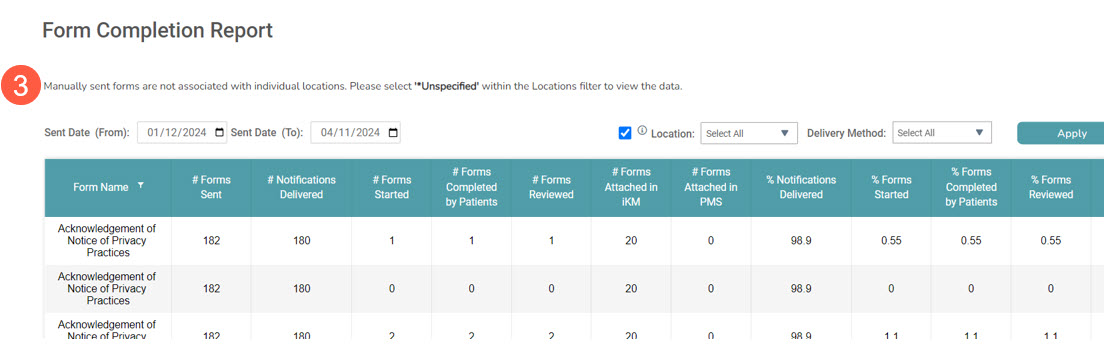 NOTE: If the Manually Sent option is selected from the drop-down, a message will display stating that, Manually sent forms are not associated with individual locations. Please select ‘*Unspecified’ within the Locations filter to view the data (callout 3). This will help guide users on how to use the report to see the correct information.