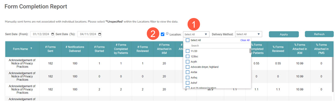 To help practices better understand their form completion rates by location, we added a new Location filter to the report (callout 1).