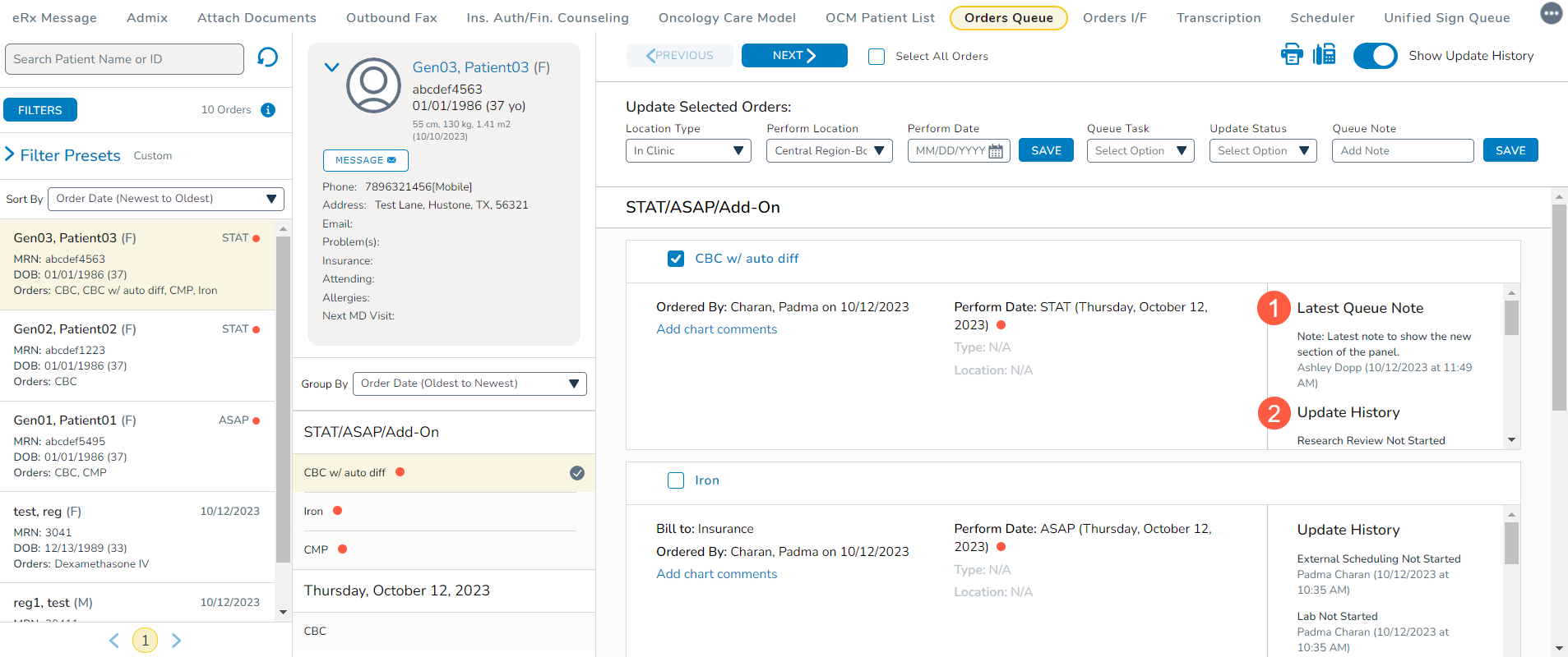 A new section called Latest Queue Note has been introduced to the Update History panel within the orders worklist. This section showcases the most recently added queue note at the top, while previous notes are displayed below it in the Update History section (callouts 1 and 2).