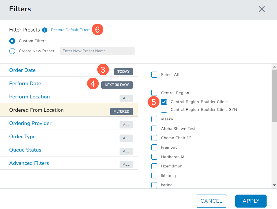 - Ordered From Location: The default Ordered From Location filter now aligns with the user’s logged-in location instead of displaying All locations. To further simplify the selection process, this filter now only displays In Clinic options (callout 5). External locations have been removed from this list as orders cannot originate from external locations.