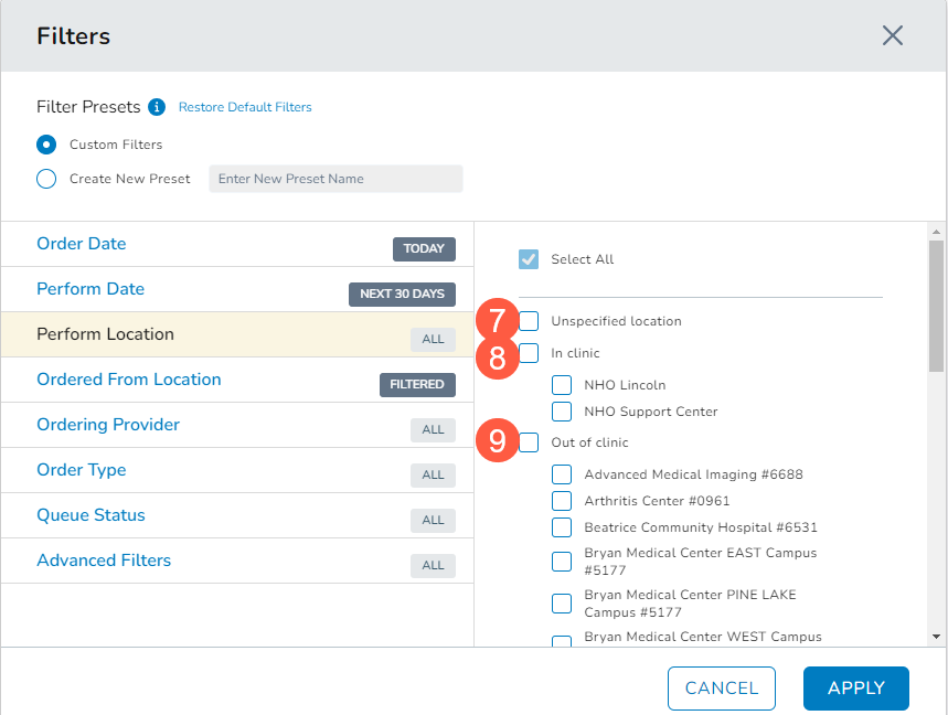 - Perform Location: The Perform Location filter list has been reorganized for ease of use. Unspecified location now appears at the top, followed by In Clinic and Out of Clinic locations. This grouping allows for convenient selection of all in-clinic or external locations at once (see callouts 7-9).
