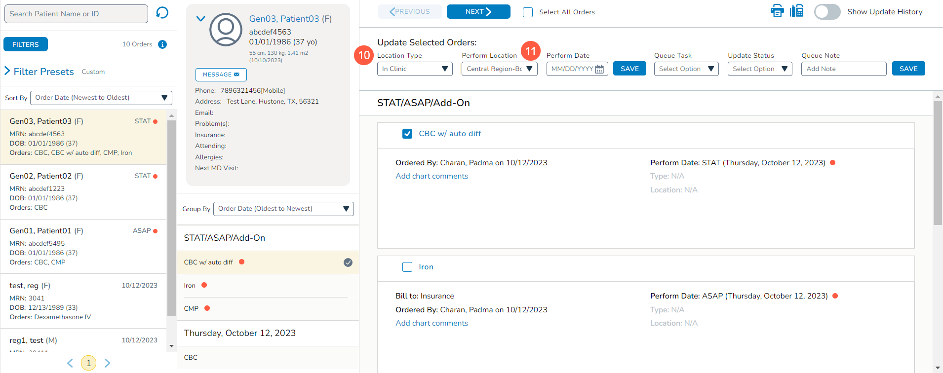 If a patient’s preferred treatment location has been designated in their Demographics tab, the queue will default to that location as the Perform Location when In Clinic is selected as the Location Type (see callouts 10 and 11).