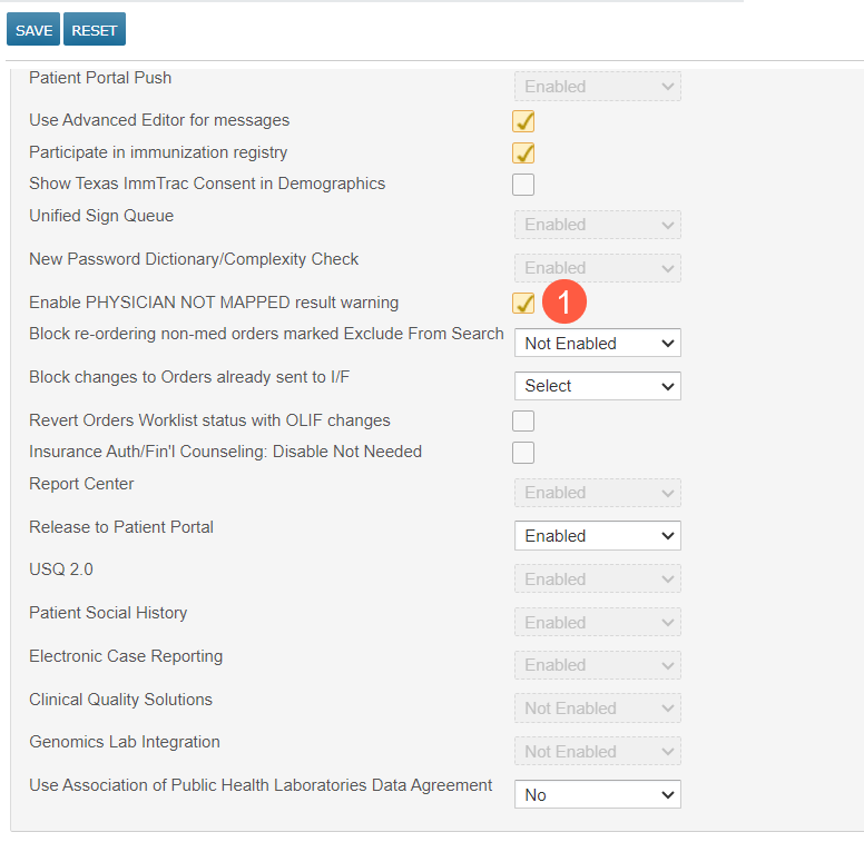 Now, you can control whether your practice sees this message using a new preference under the Other Feature section called Enable PHYSICIAN NOT MAPPED result warning (callout 1). This preference will be on by default but can be turned off if you do not wish to see these error messages going forward.