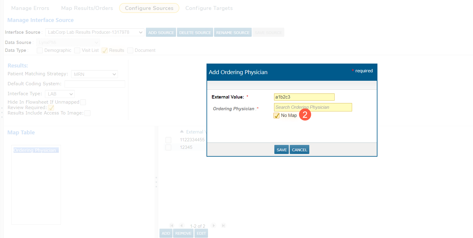You can also enter an external value and check the new No Map box when adding or editing ordering providers on the Configure Sources page (callout 2).