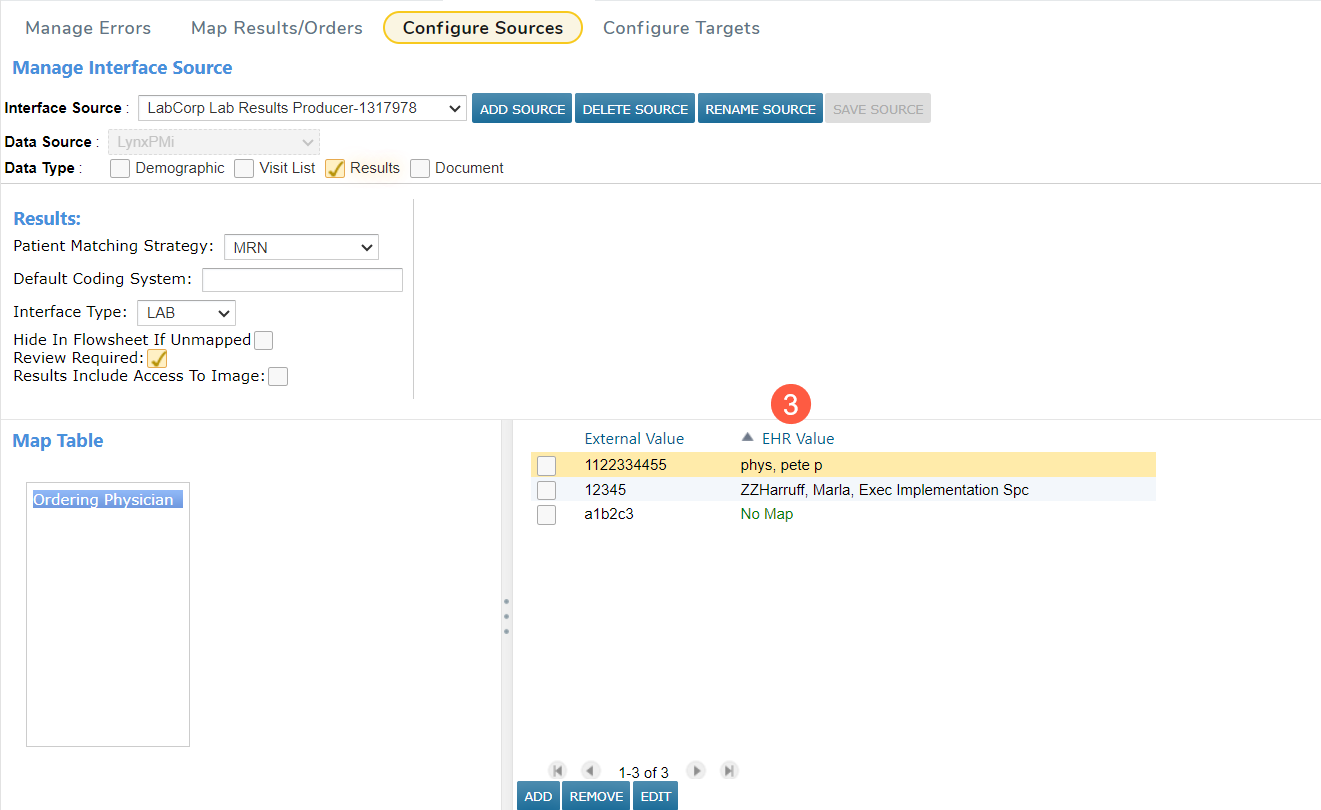 Lastly, sort the Ordering Physicians table alphanumerically by clicking on the External Values or EHR Value headers (callout 3) to view which ordering providers are mapped and which are not.