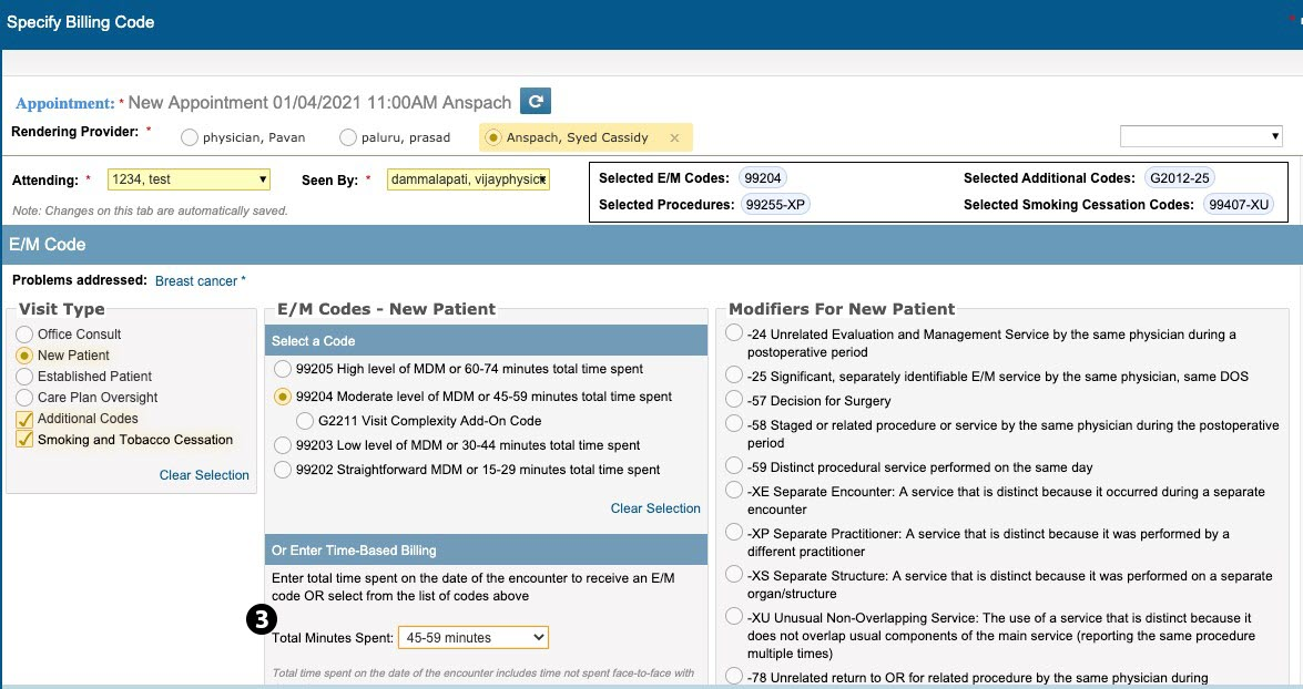 1. Based on the new CPT 2021 E/M codes, providers may bill for total time spent on the date of the encounter using the Total Minutes Spent drop-down, which allows you to choose a time frame and automatically selects the correct E/M Codes and Prolonged Codes for a New Patient or Established Patient visit (see callout 3).